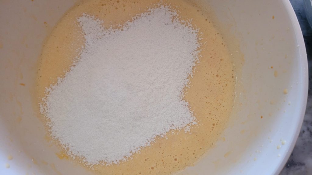 Voeg aan het mengsel de bloem, het bakpoeder en de vanilline toe, gezeefd, beetje bij beetje en meng voorzichtig met een spatel.
