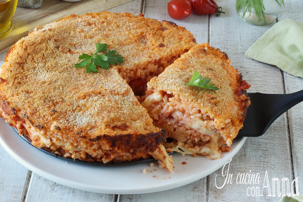 De gebakken rijst pizzaiola-stijl is een zeer eenvoudig te bereiden hoofdgerecht, snel, smeuïg en super smakelijk met veel Parmezaan en gesmolten mozzarella. Perfect voor de lunch van het hele gezin, het zal iedereen veroveren met zijn heerlijke smaak.