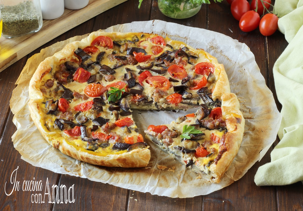 Hartige taart met aubergines, worst, stracchino en kerstomaatjes.