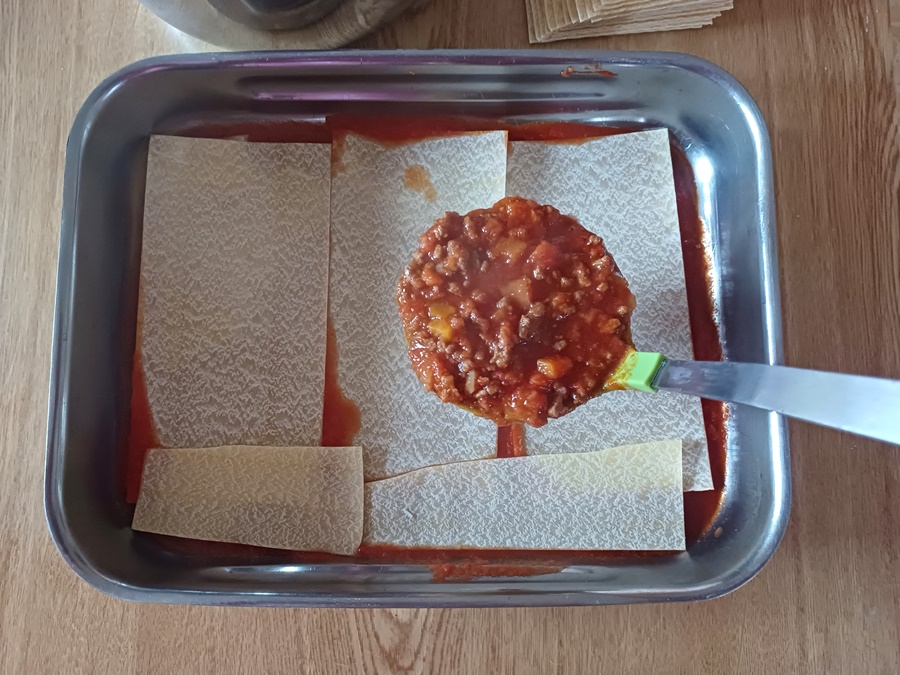 Soms maak ik ook apart 300 ml tomaat (gehaald uit het totaal) gekookt met gewoon ui en gehakte wortel, zout en peper zonder het te veel te laten inkoken, en gebruik het alleen voor de eerste en laatste laag, je kunt dit ook doen, of alleen de ragù gebruiken als eerste en laatste laag.