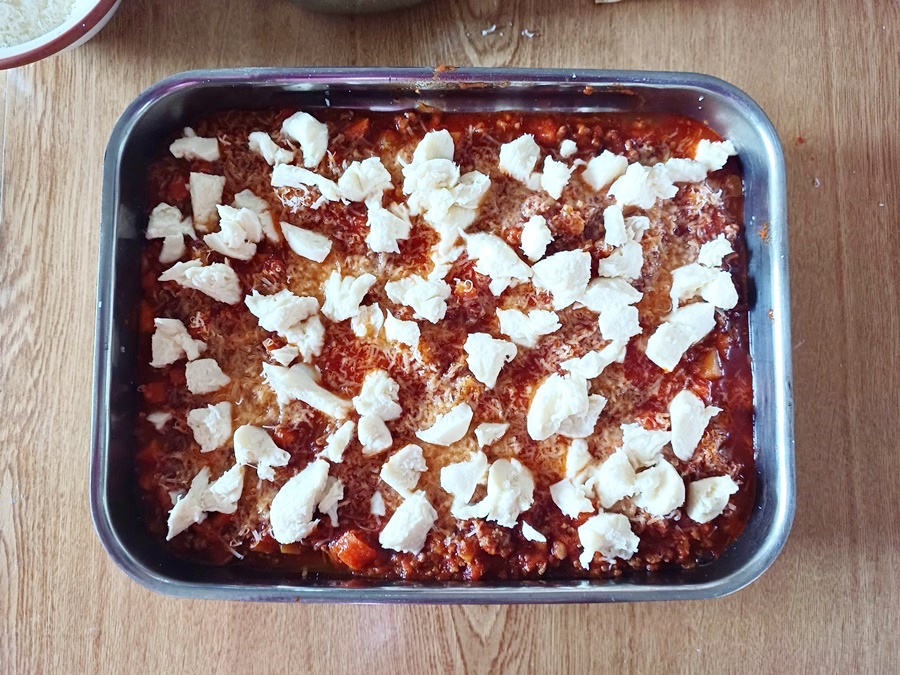 Ga zo door in lagen: pasta, ragù, geraspte kaas en mozzarella.
