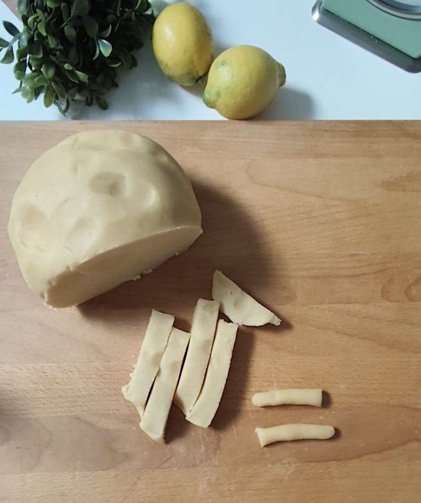 Op een licht met bloem bestoven deegplank maak je staafjes van 1 cm dik en snijd ze in staafjes van ongeveer 56 cm.