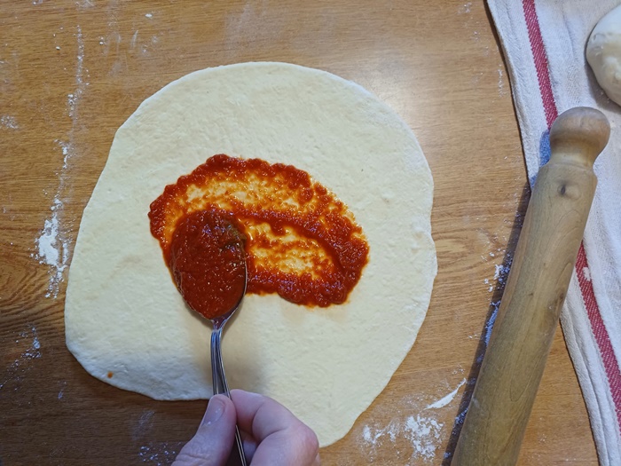 Snijd de mozzarella in blokjes en laat ze uitlekken in een zeef in de koelkast.Na de tweede rijstijd, rol je een bal deeg tegelijk uit op een licht met bloem bestoven werkblad met de deegroller zoals op de foto.