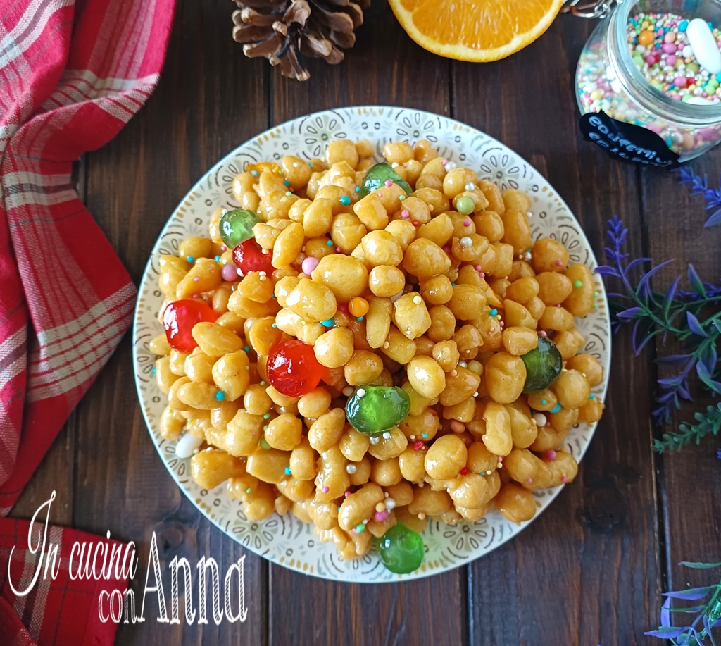 De Purceddhruzzi salentini (purcidduzzi) zijn een typisch Pugliese dessert voor de Kerstperiode, qua uiterlijk lijken ze erg op de Napolitaanse struffoli, vaak wordt gedacht dat het hetzelfde is, maar de gelijkenis eindigt bij de vorm en de honingglazuur, terwijl de ingrediënten anders zijn, ze bevatten geen eieren, maar olie en likeur en ze zijn ook anders in textuur, de purcidduzzi zijn zachter, maar de smaak blijft even heerlijk, net als struffoli zijn ze absoluut het proberen waard 🙂