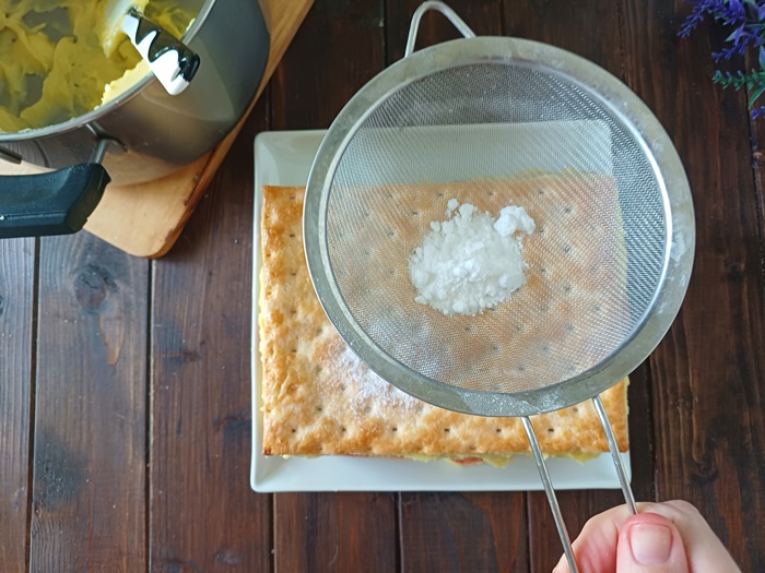 Maak het af met het laatste bladerdeeg en bestrooi met poedersuiker.