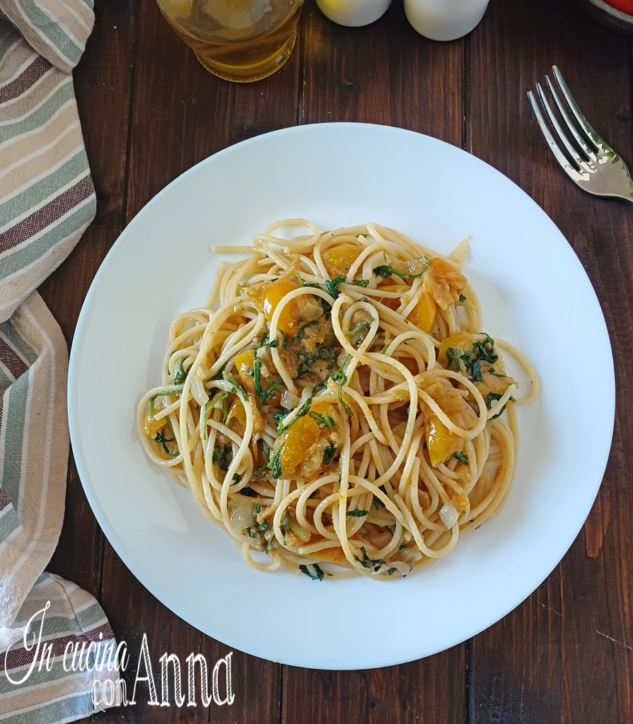 De spaghetti met gele cherrytomaten en bottarga is een zeer eenvoudig en snel te bereiden gerecht, maar tegelijkertijd verfijnd en zeer smaakvol. De toevoeging van rucola maakt dit gerecht nog delicater en smakelijker (u kunt de rucola ook weglaten, maar ik raad u aan het ook zo te proberen); een perfect gerecht voor elke gelegenheid en dat iedereen zal verrassen bij de eerste hap.