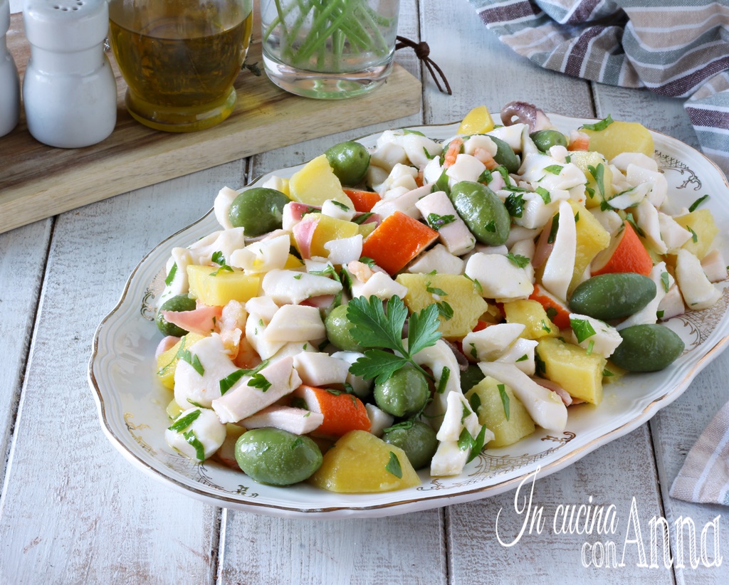 De zeesalade met aardappelen is een traditioneel gerecht uit de mediterrane keuken; lekker, licht, voedzaam, fris, rijk en kleurrijk, het is een perfect gerecht voor vele gelegenheden: als zeevruchten voorgerecht, maar ook als hoofdgerecht voor een smakelijk diner, of als tweede gang na een heerlijk voorgerecht van zeevruchten. Ook perfect als kerstvoorgerecht is het een ideaal gerecht voor het hele gezin, probeer het, het zal iedereen blij maken bij de eerste hap.