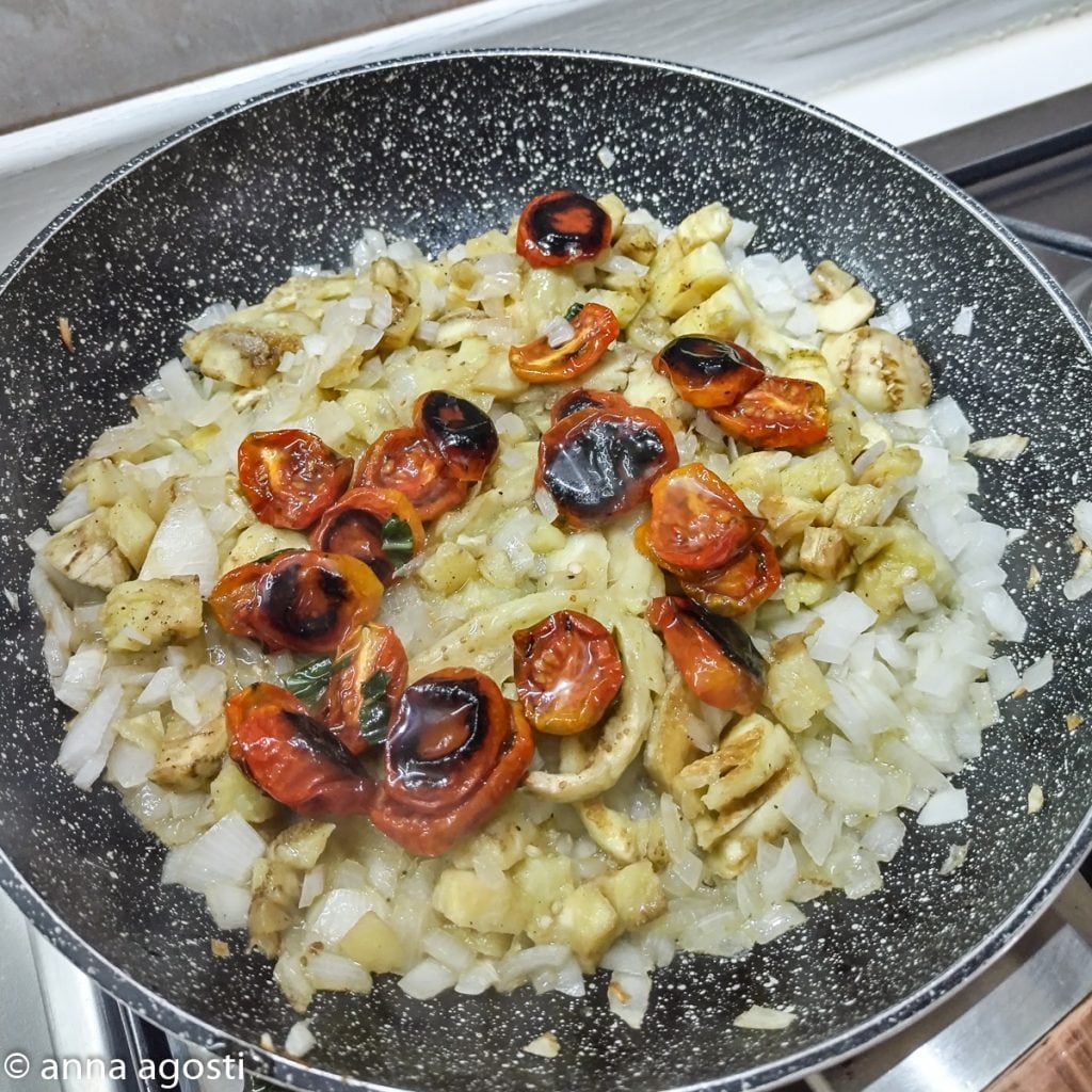 Snijd de pulp met ruitvormige sneden, zout het lichtjes en leg het in een ovenschaal met 4 eetlepels warme extra vergine olijfolie.