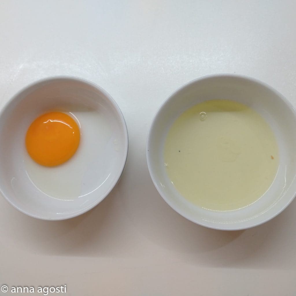Breek 4 eieren en scheid de dooiers van de eiwitten: giet de eiwitten in de holtes van de mandjes, bestrooi met zout en bak 20 minuten in de oven op 200°C.