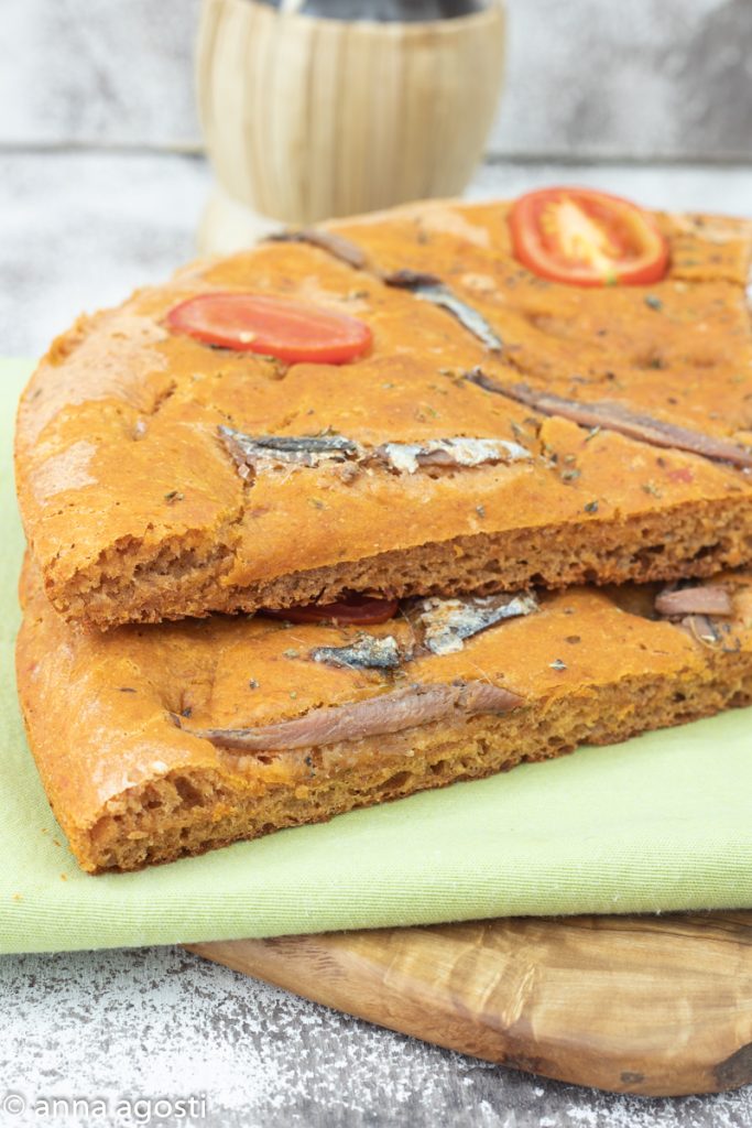 De basis ingrediënten omvatten bloem, gist, water, olijfolie en gepelde tomaten, waaraan andere toppings zoals oregano, chilipeper, en ansjovis kunnen worden toegevoegd, typisch voor het mediterrane dieet. Het gebruik van gepelde tomaten, rijk aan smaak en sappig, geeft de focaccia een donkerrode kleur en een unieke en onmiskenbare smaak.