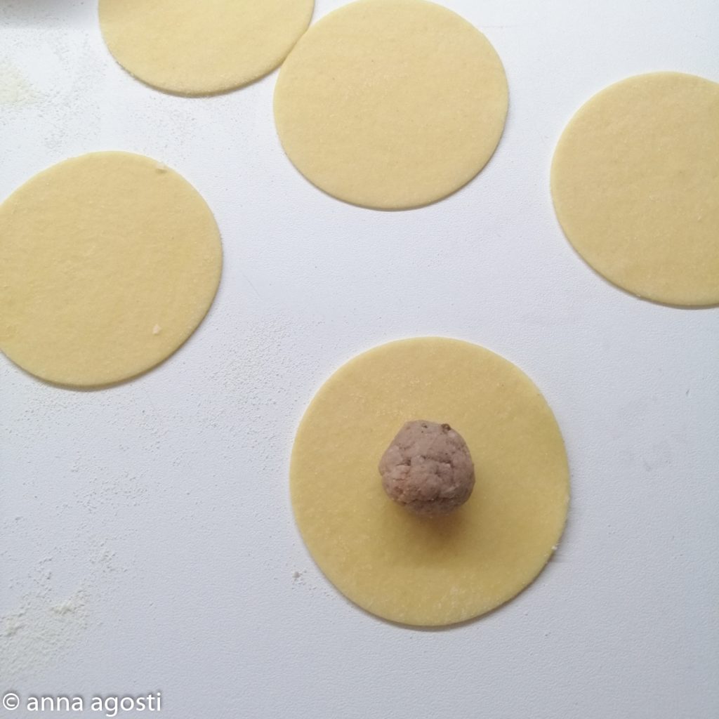 • Neem met je handen een klein balletje vulling (ongeveer 7 gram) en plaats het in het midden van elk pastarondje.
