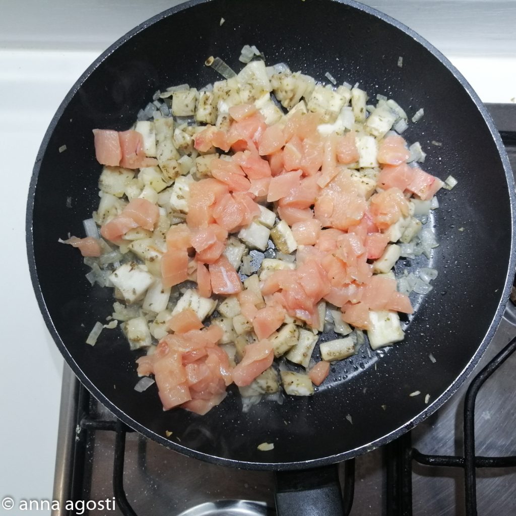Voeg de aubergineblokjes toe zodra de uien glazig worden. Laat ze koken en roer af en toe.
