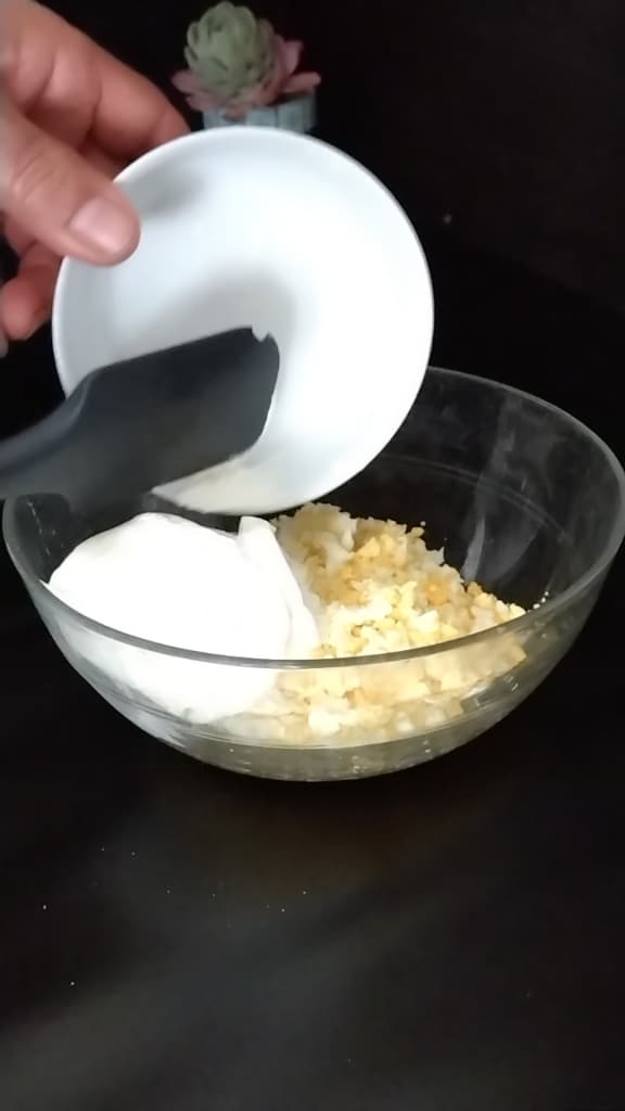 Voeg aan de gekookte eieren de zure room of ricotta toe.