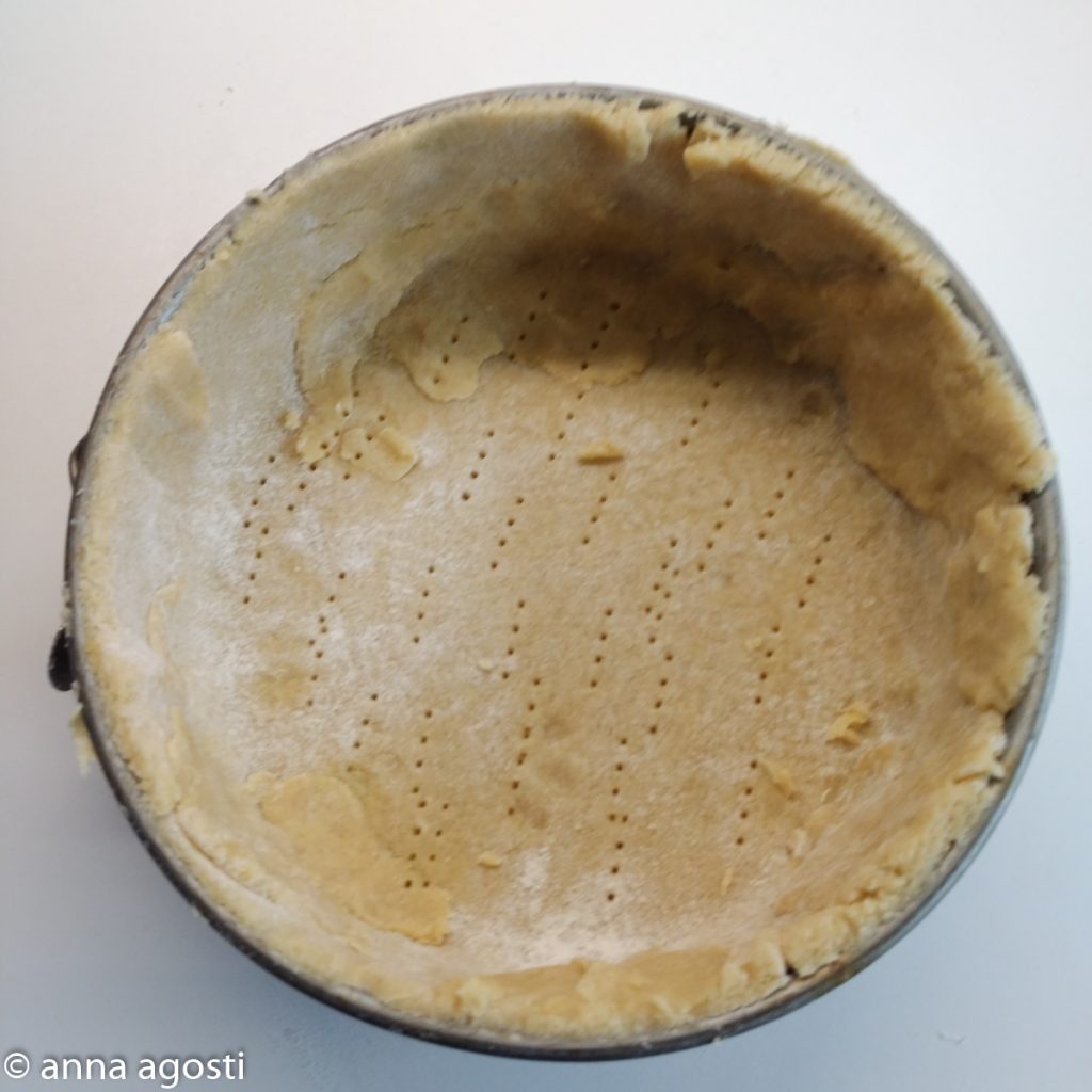 Haal het deeg uit de koelkast en rol het uit tot een dikte van 5 mm met de deegroller, bekleed de vorm en prik met de tanden van een vork in de bodem.