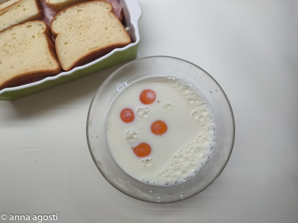 Gewoon oud brood, kaas, een paar plakjes gekookte ham en eieren met melk om alles te weken, na 20 minuten in de oven zal het klaar zijn.