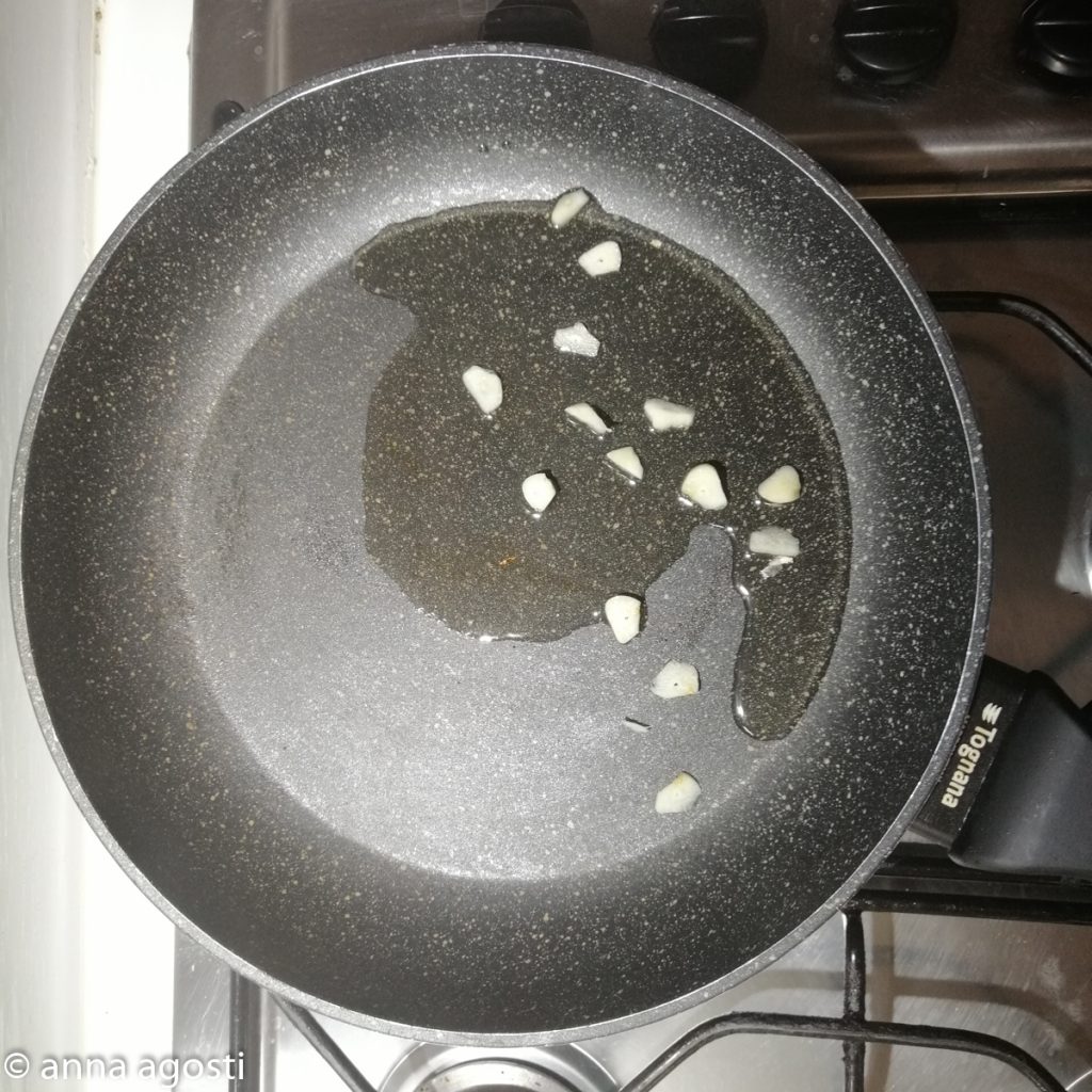 Verwarm de extra vergine olijfolie in een grote pan en fruit de plakjes knoflook.