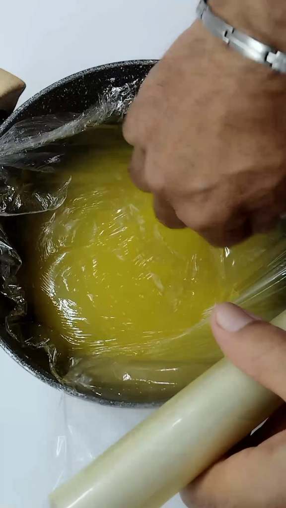Laat het afkoelen met plasticfolie direct op het oppervlak om te voorkomen dat er een velletje ontstaat en..
