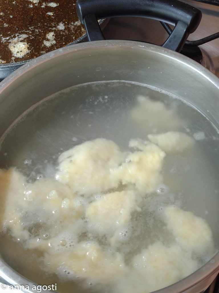 5-Neem het deeg in onregelmatige stukjes en kook ze in gezouten kokend water.