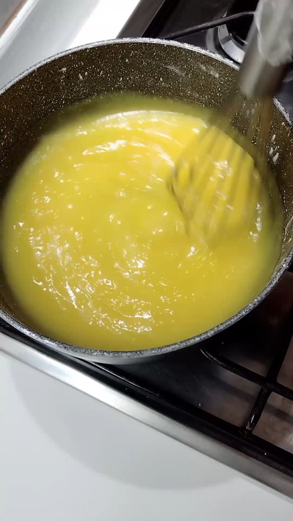 Breng op het vuur en kook de oranje crème al roerend met de handgarde tot hij indikt.
