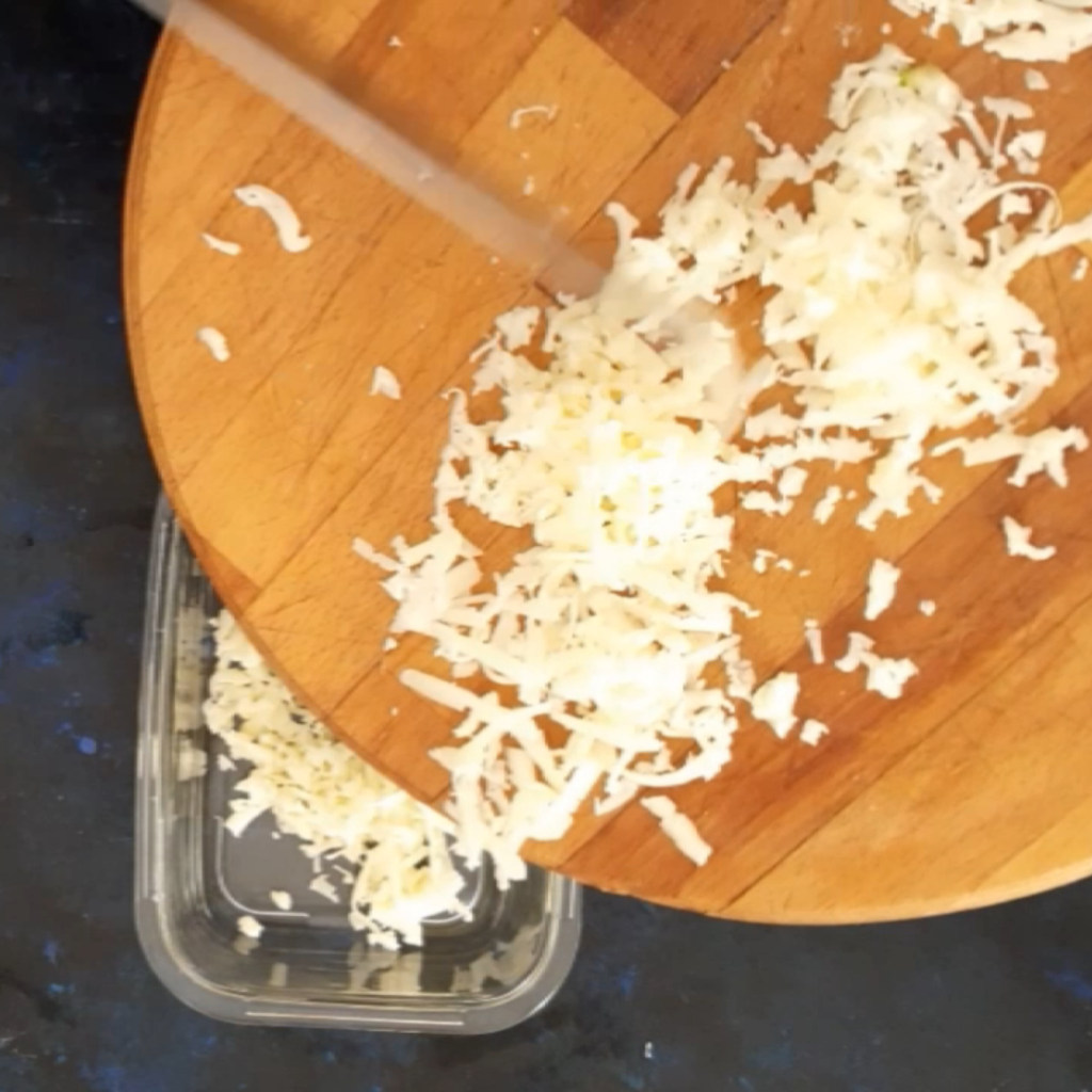 Bereid de zonnebloem van courgettes voor door de courgettes te raspen met een grove rasp.
