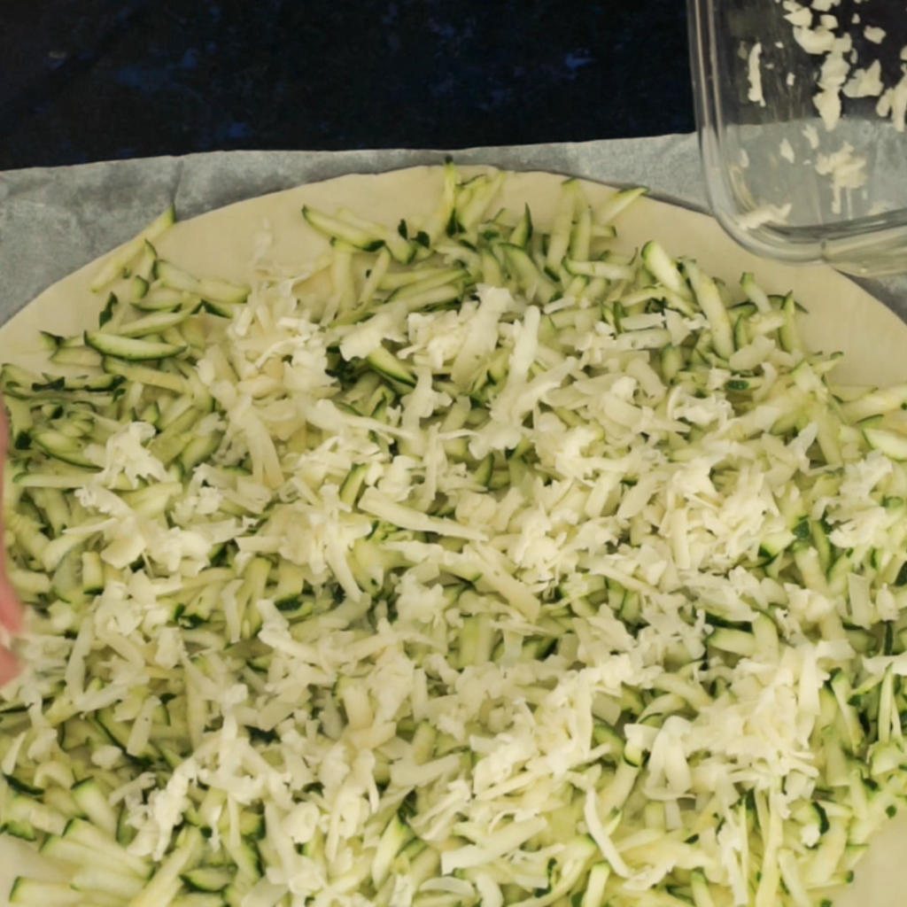 Rol de eerste schijf bladerdeeg uit en bedek deze met de geraspte courgettes.