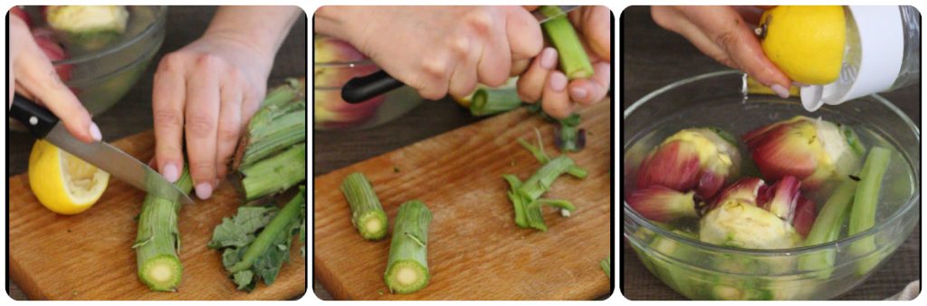 Schraap de stengels schoon en leg ze samen met de artisjokken in een kom met water en citroensap, zodat ze groen blijven en niet zwart worden.