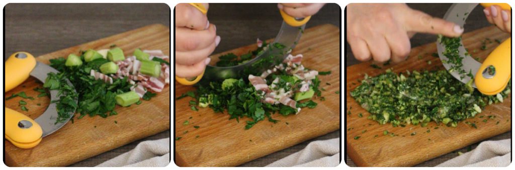 Maak nu de vulling: hak vrij fijn met een mezzaluna op het snijplankje de pancetta, de knoflookteentjes, de peterselie en enkele stengels artisjok. Voeg zout en peper toe en meng alles goed door elkaar.