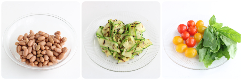In een grote kom verzamel je de gekookte borlottibonen, de gegrilde courgettes in dunne plakken in de lengte (voor een meer spectaculaire effect!), de doormidden gesneden kerstomaatjes en een paar met de hand gescheurde basilicumblaadjes om al hun geur vrij te laten.