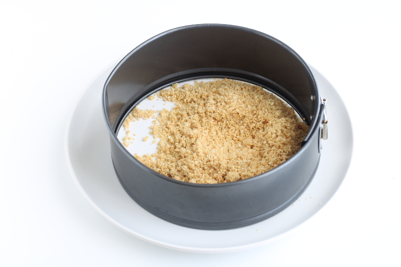 Plaats de springvorm zonder bodem direct op een serveerschaal, verdeel dan het koekjesmengsel in de vorm en druk het goed aan met een lepel. Zet de bodem in de koelkast.