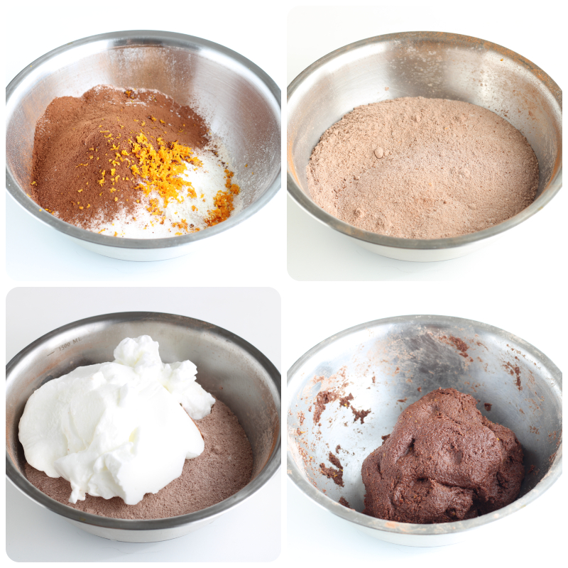 Meng de gezeefde bloem met de suiker, het cacaopoeder, een zakje vanilline, een theelepel bakpoeder en de geraspte schil van een eetbare sinaasappel.