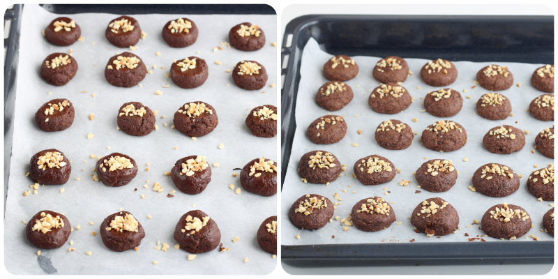 Druk met de achterkant van een theelepel lichtjes in het oppervlak en verdeel op elk koekje wat hazelnootstukjes.
