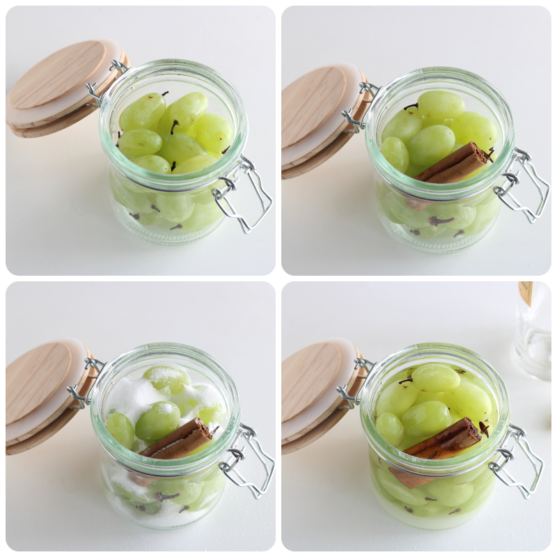 Vul de gesteriliseerde potten (hier vind je hoe je potten en deksels steriliseert) met de druiven. Ik heb twee potten van 500 ml gebruikt, gevuld tot ongeveer 2 cm van de rand.