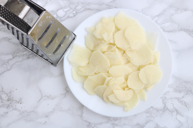 Verwijder de schil van de aardappelen met een dunschiller, snijd ze vervolgens dun met de 4-zijdige rasp, gebruik de juiste kant.