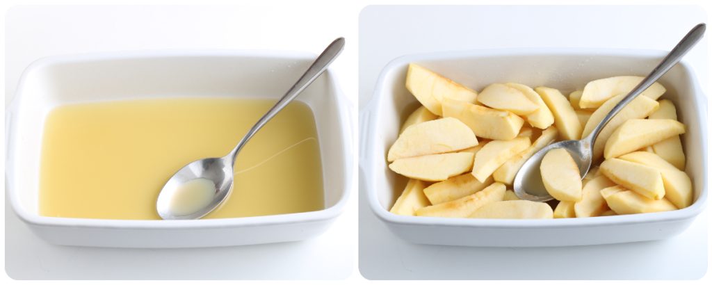 Giet een glas appelsap op de bodem van een ovenschaal, leg daarna de in partjes gesneden appels erop.