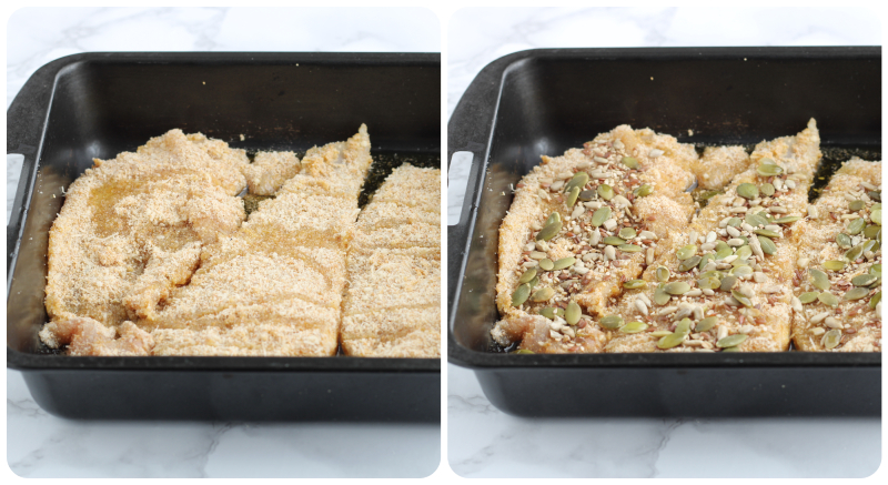 Vet een bakplaat in met olie (je kunt ook bakpapier gebruiken) en leg de gepaneerde kipplakjes naast elkaar. Besprenkel het oppervlak met een beetje olie, voeg zout toe en verdeel als laatste de gemengde zaden over elke kipfilet (ongeveer 10 g. per plakje).