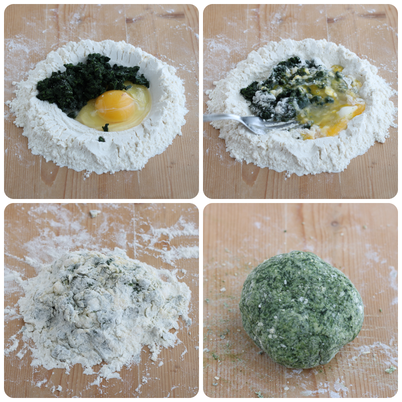 Volg de bovenstaande procedure voor het basis witte deeg, voeg bovendien de fijngehakte spinazie toe, in het bergje samen met het ei.