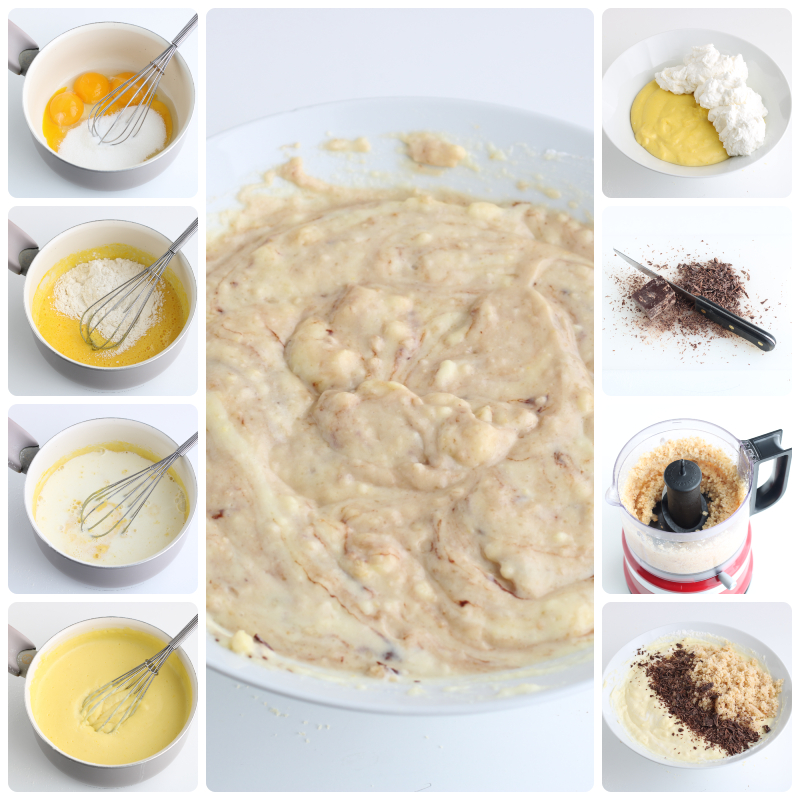• Bereid nu de chantilly room: klop in een steelpan de eidooiers met de resterende suiker, voeg de bloem toe en giet de zeer hete melk erbij. Roer en zet het op het vuur om in te dikken, vaak roeren. Breng het over in een kom, voeg de goed opgeklopte slagroom toe (zie hoe perfecte slagroom te maken), voeg dan de helft van de in kleine stukjes gesneden chocolade, de fijngehakte gekaramelliseerde hazelnoten in een blender en meng alles.