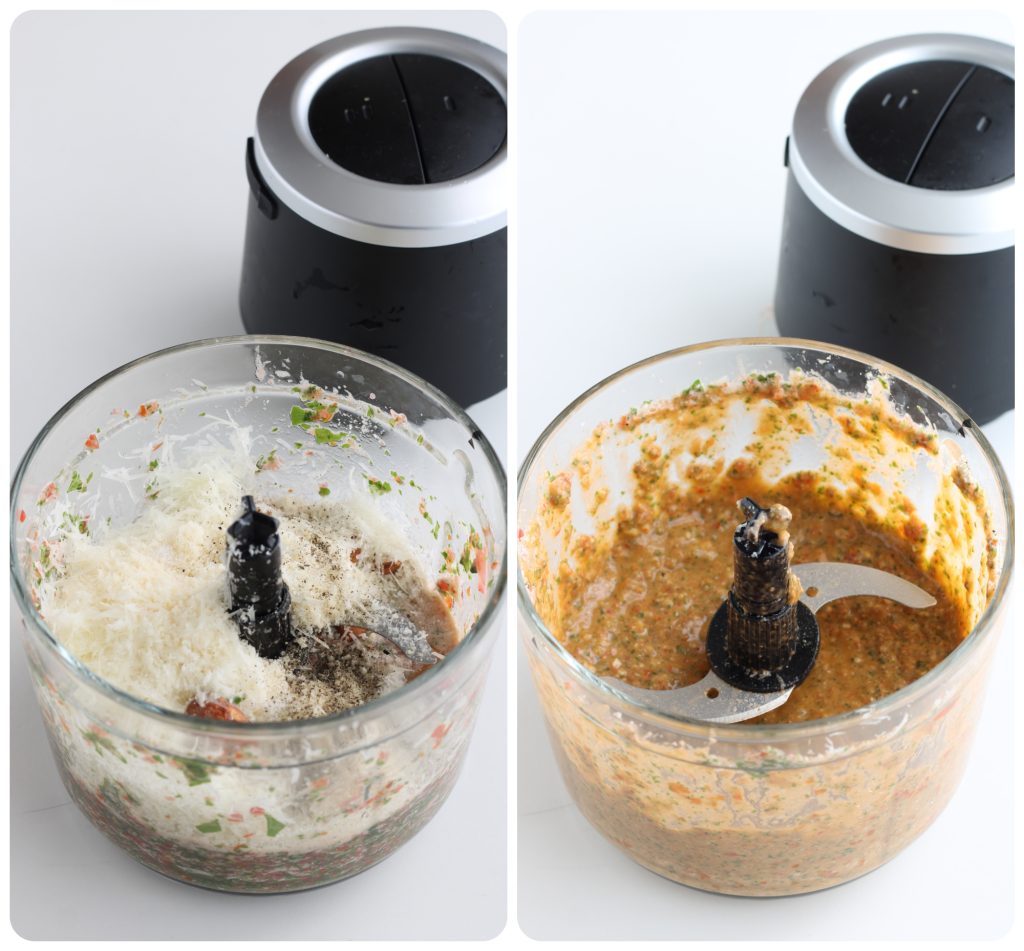 Doe deze ingrediënten in de hakmolen en begin te mixen door de pulseerfunctie een paar seconden in te schakelen.
