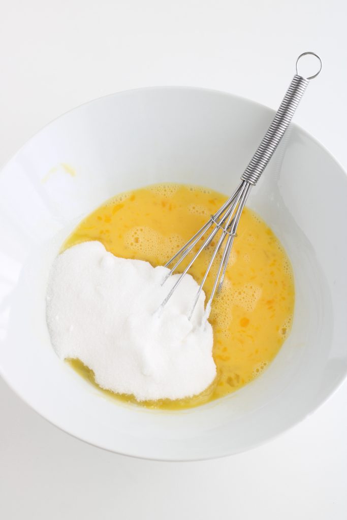 Na deze bewerking ga je door met het maken van de plumcake: breek 4 hele eieren in een kom.Klop de eieren met 2 potjes suiker met een garde tot je een gladde crème hebt.