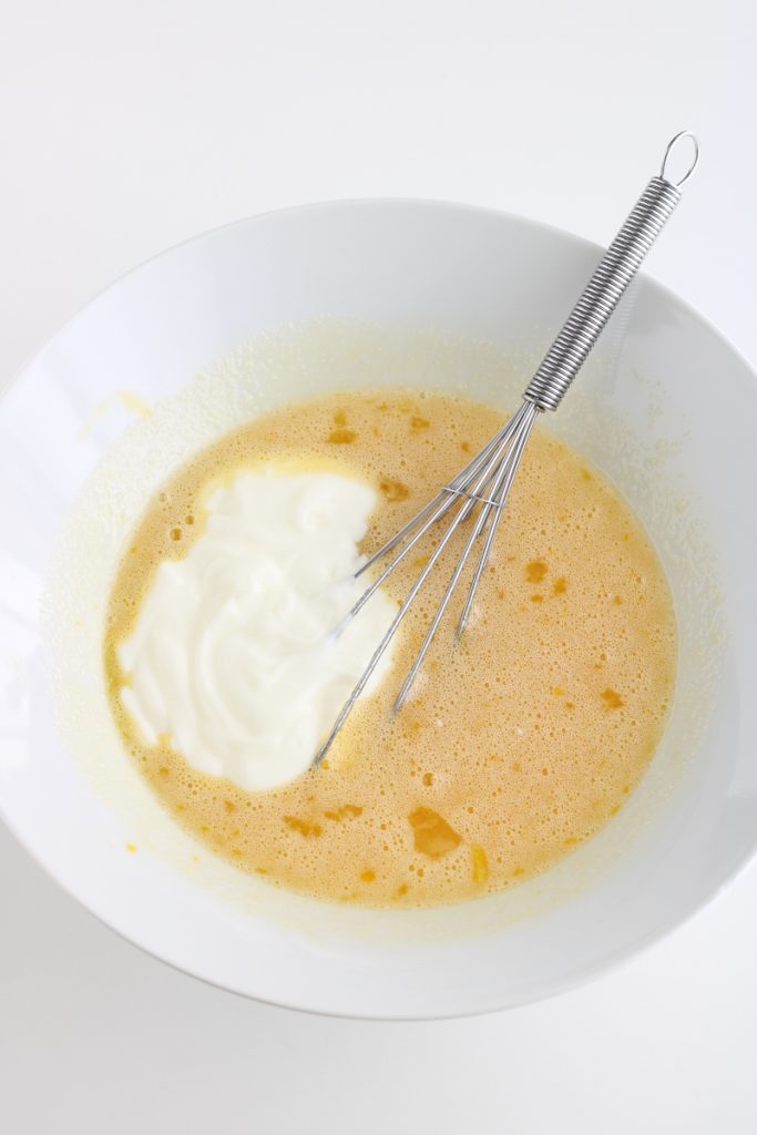 Let op: de bloem, suiker en olie worden afgemeten met het potje waarin de yoghurt zit, dus verplaats de yoghurt eerst naar een glas, was en droog dan de container goed.
