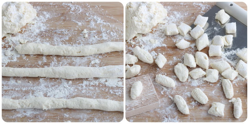 Bestuif het werkblad lichtjes, leg het deeg erop en verdeel het in meerdere delen. Met je handen vorm je rolletjes van ongeveer 2 cm dik, zonder het deeg te veel plat te drukken. Snijd dan de gnocchi met een deegsteker. Als je wilt, kun je ze over een gnocchiplank of de tanden van een vork rollen om de klassieke ribbel te geven.