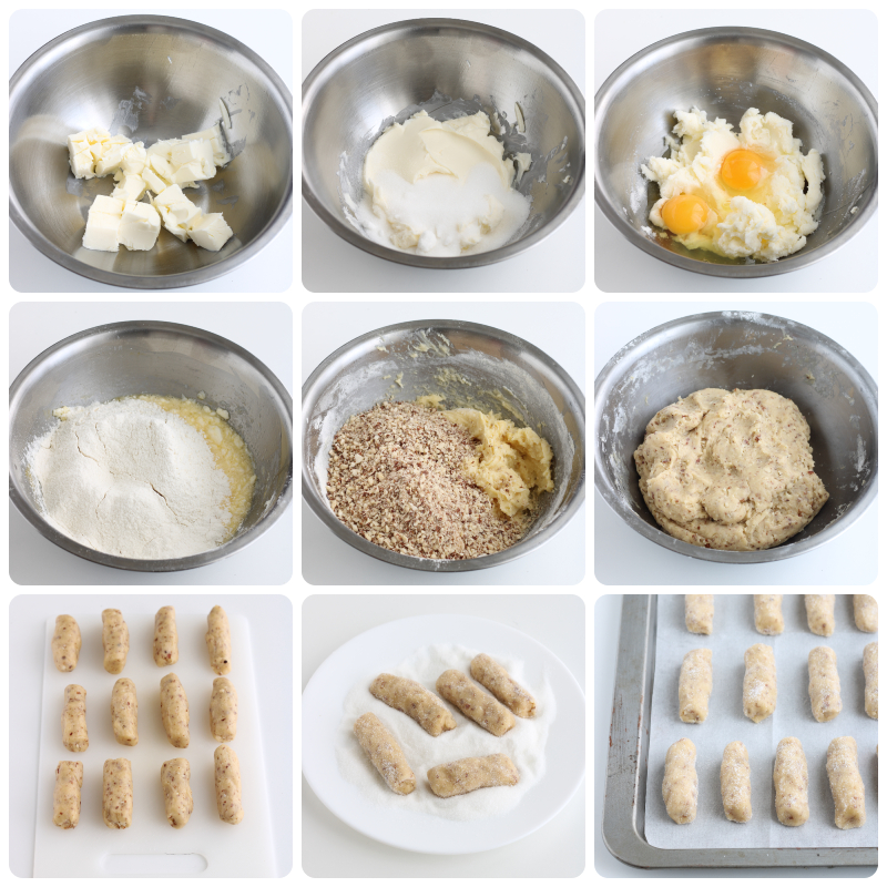 Voeg aan het deeg de amandelen toe die je grof gehakt hebt met een mixer en kneed ook met de hand, totdat je een homogeen deeg krijgt.Geef nu vorm aan je koekjes: maak met een beetje deeg staafjes van ongeveer 5 cm lang, rol ze in de resterende suiker en leg ze naast elkaar op een met bakpapier beklede bakplaat.