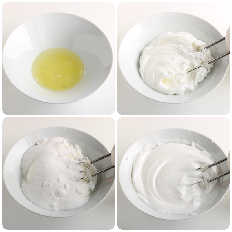 • Breek de eieren en scheid het eiwit van het eigeel en klop de eiwitten stijf met een elektrische garde, daarna voeg je de suiker toe.