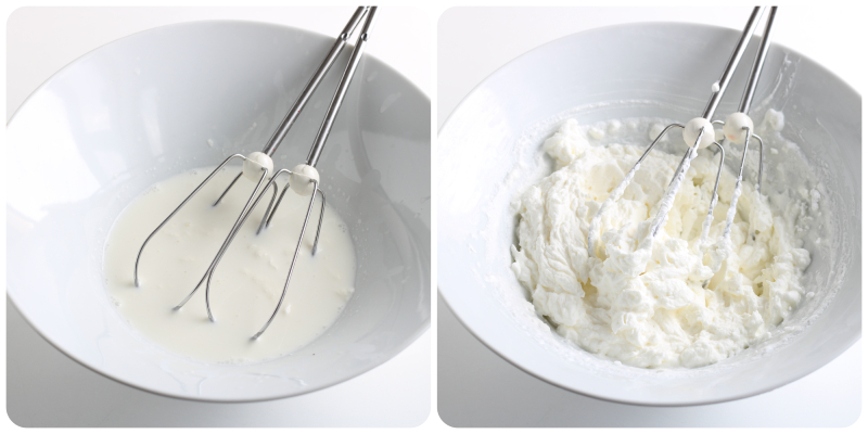 • Klop de slagroom op met een elektrische garde en voeg daarna de poedersuiker toe (hier vind je alle tips voor hoe je perfecte slagroom kunt maken).