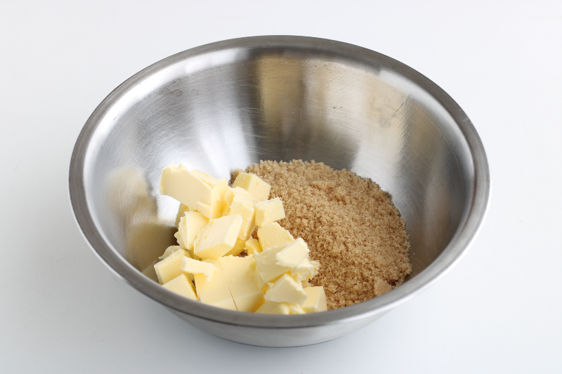 Doe de rietsuiker en de koude in stukjes gesneden boter in een kom.
