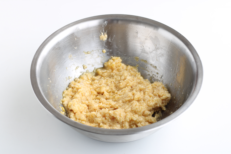 Prak de boter samen met de suiker met een vork en voeg vervolgens een heel ei toe.