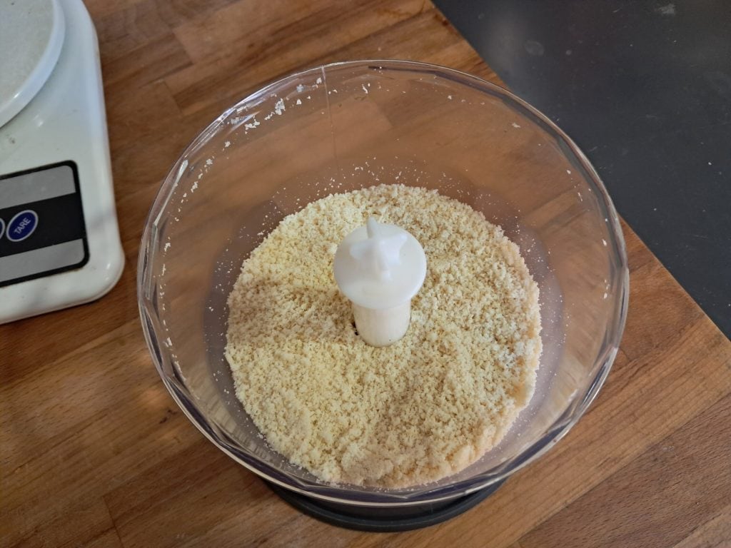 • Hak ondertussen de amandelen met een hakmolen, maak ze niet tot poeder maar laat ze iets grof.