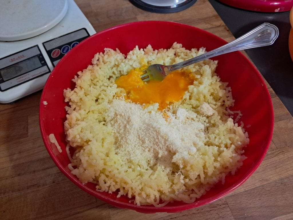 • Voeg dan de geraspte Grana Padano toe, een snufje zout en wat vers gemalen peper.