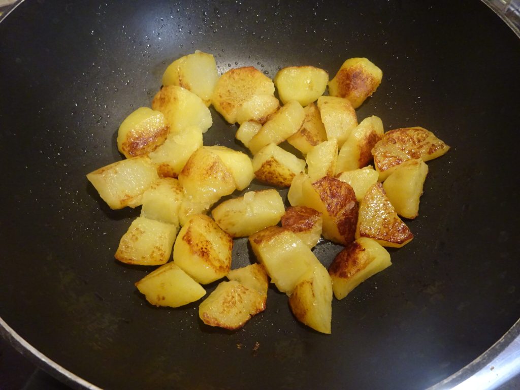 Eenmaal gaar, laat ze 5 minuten afkoelen. Doe ze dan in een wok met 2 eetlepels olijfolie en bak ze op middelhoog vuur tot ze aan alle kanten goudbruin zijn.