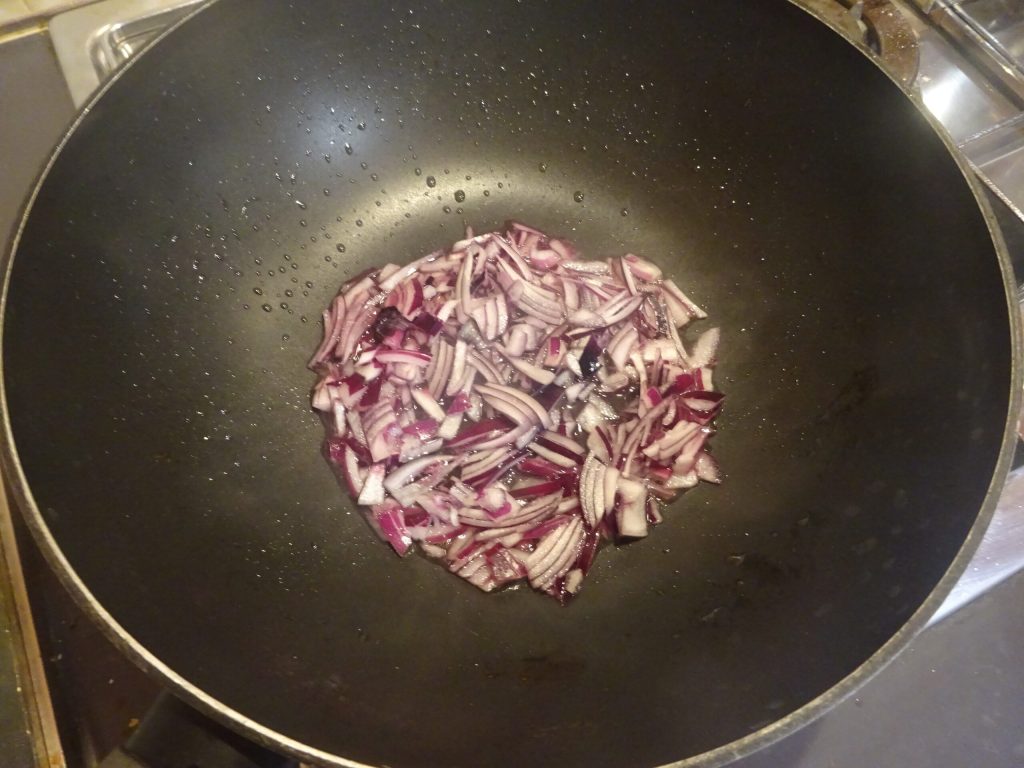 In dezelfde wok waar je de aardappelen hebt gebakken, voeg de fijngesneden ui toe, een paar eetlepels water en kook met deksel tot de ui goed zacht is.